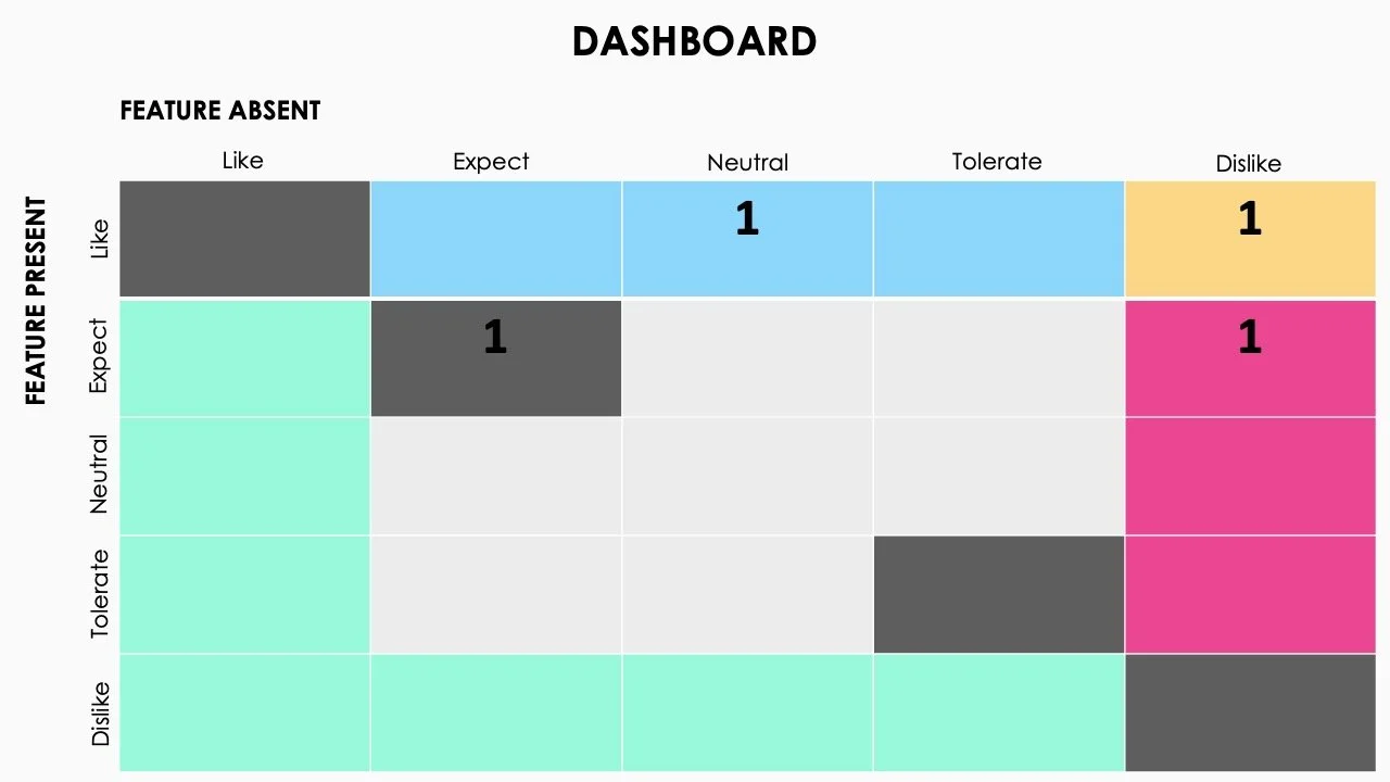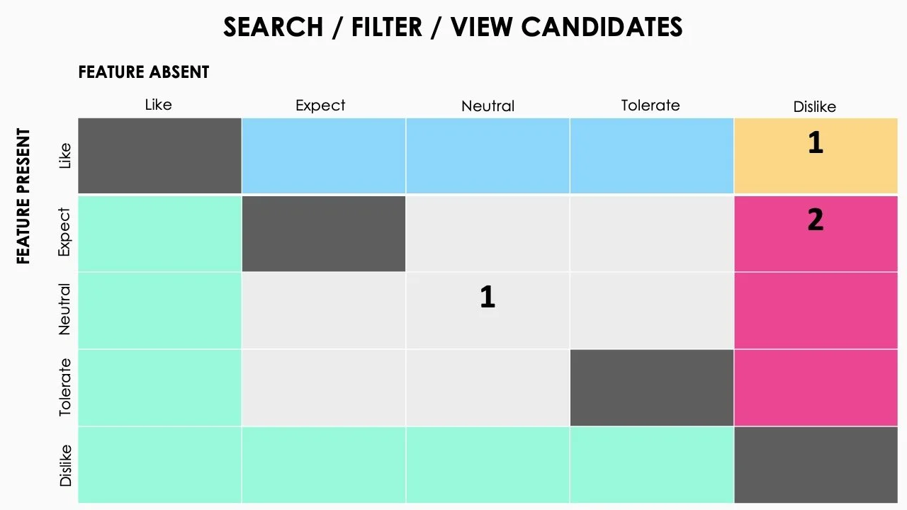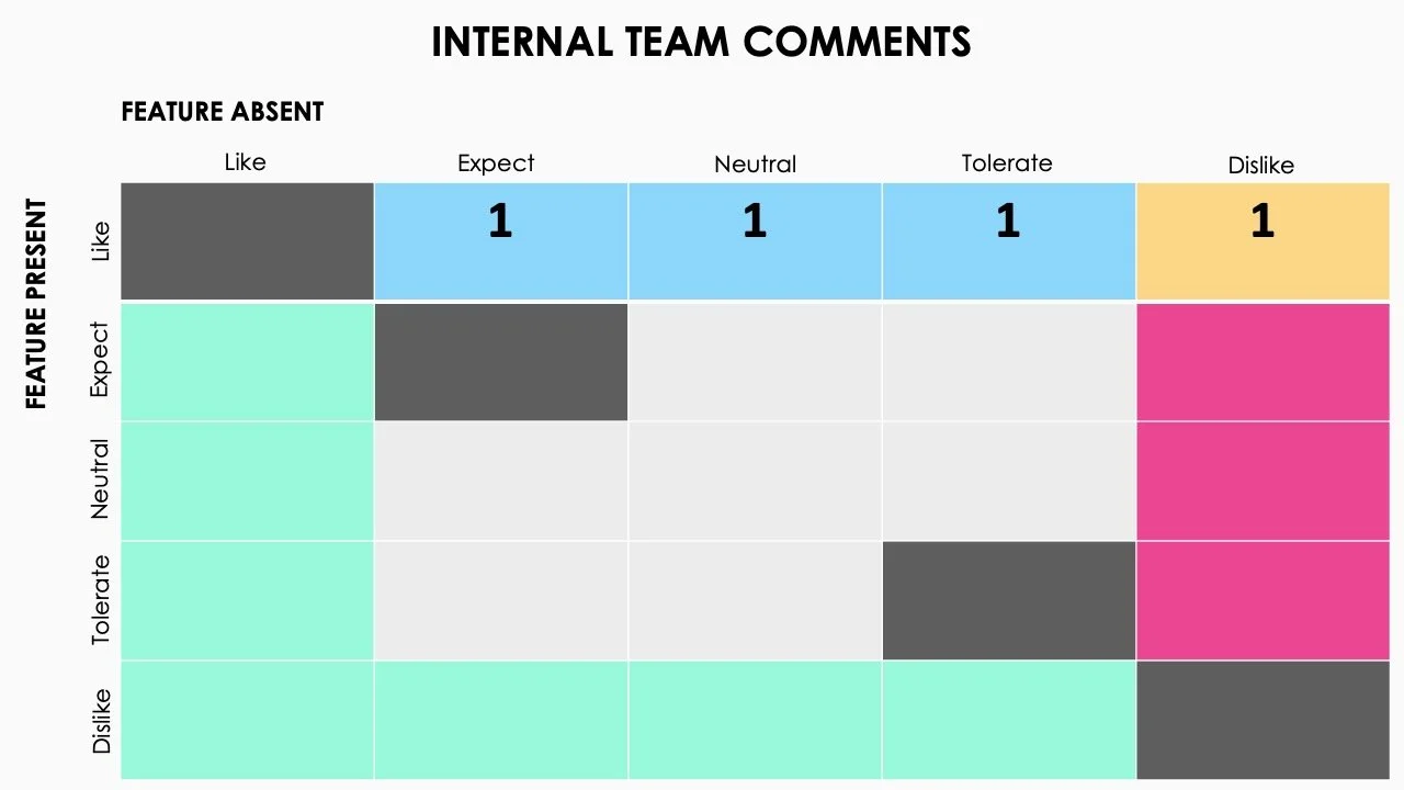 From the many ideas we created, we honed down to a list of 10 to present to four current IOD users. We surveyed them using the Kano Analysis method to determine which of our proposed features would be considered “must-haves” and which would be “anti-features” that would negatively impact customer satisfaction.