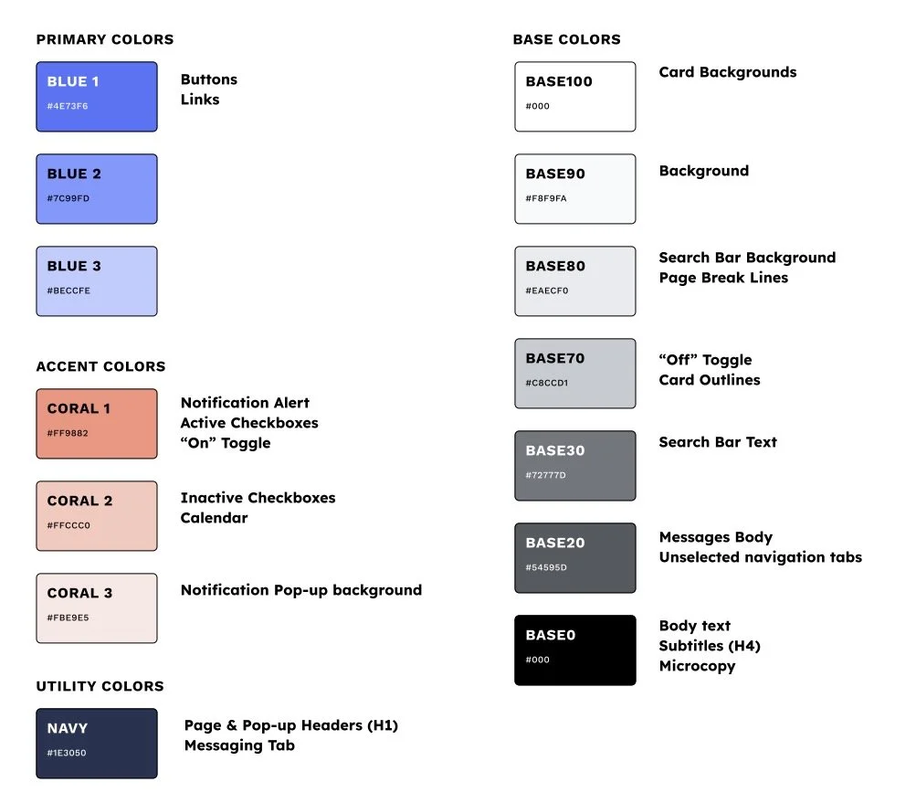 The coral accent color was added as an extra complimentary pop. Because the color contrast of this color paired with our white and off-whites is not as accessible as the blue palette, we used this color minimally.